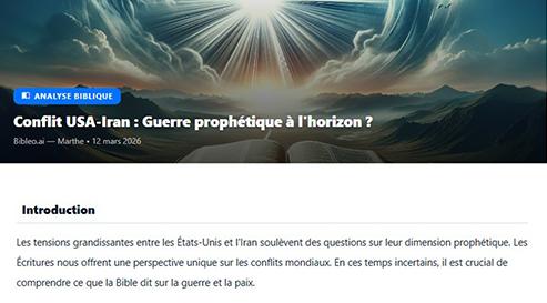 À partir d'une phrase, Bibleo génère un article complet croisant l'actualité géopolitique et les textes prophétiques — puis l'enregistre en audio TTS prêt à diffuser.